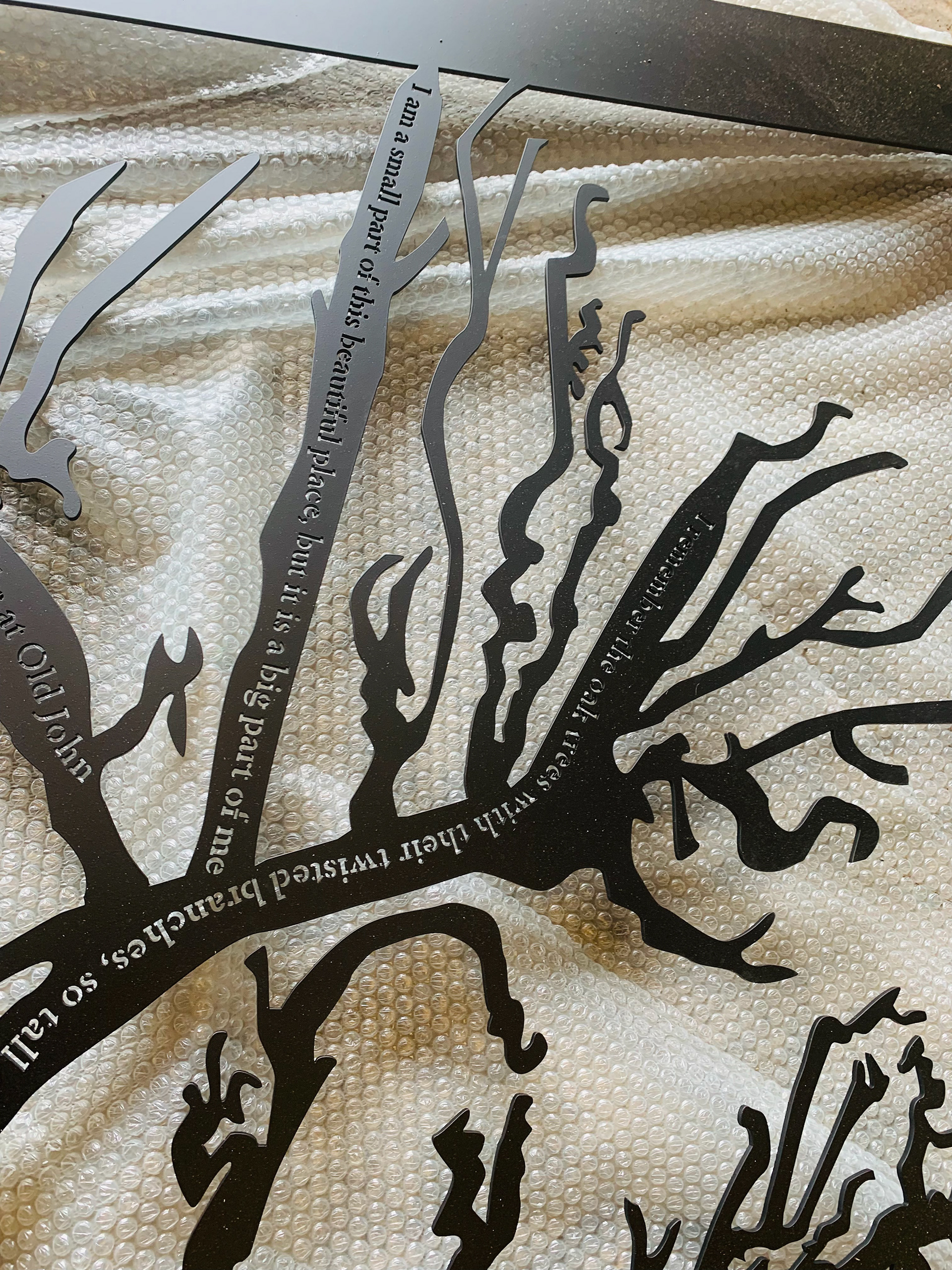 This was a commissioned piece of metal art work for Leicestershire's Bradgate Park, working in collaboration with Buzzing Roots. Members of the community attended workshops where they work with other artists to create a collaborative poem capturing their memories of trips to Bradgate Park. Aspects of the poem were used as part of the artwork which was unveiled at the Queen's Jubilee Celebration.